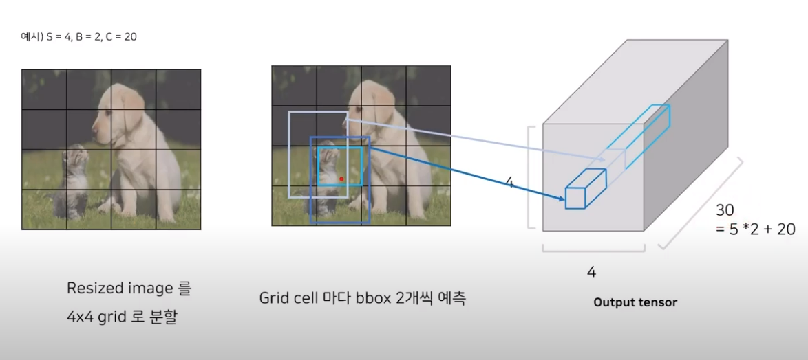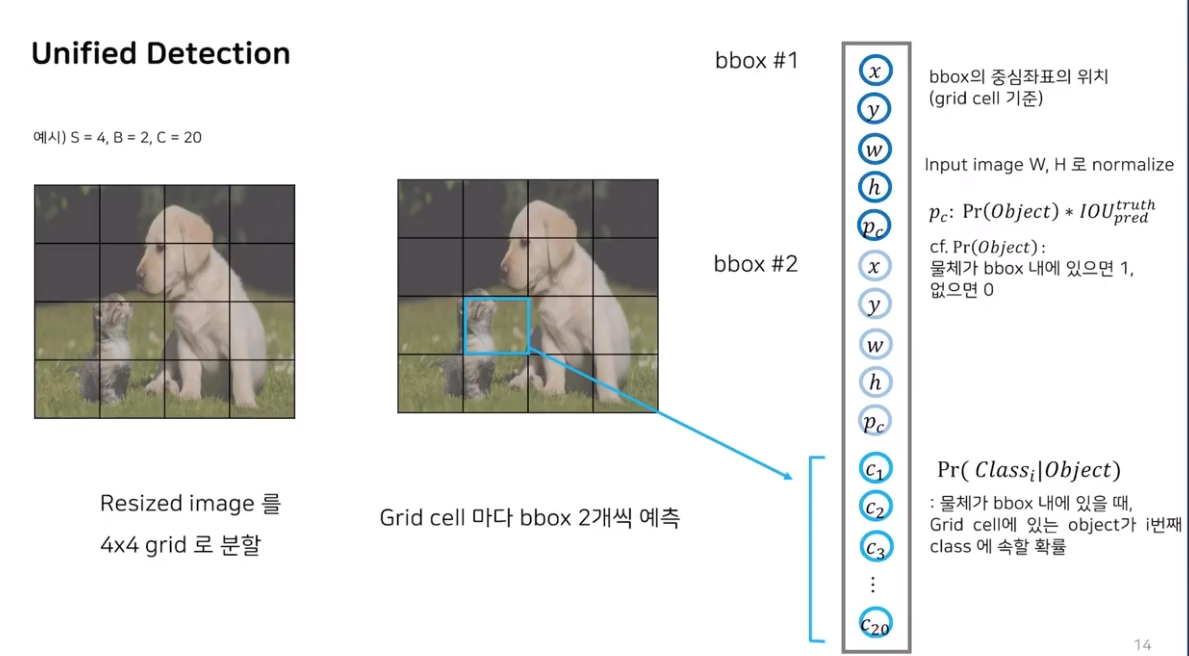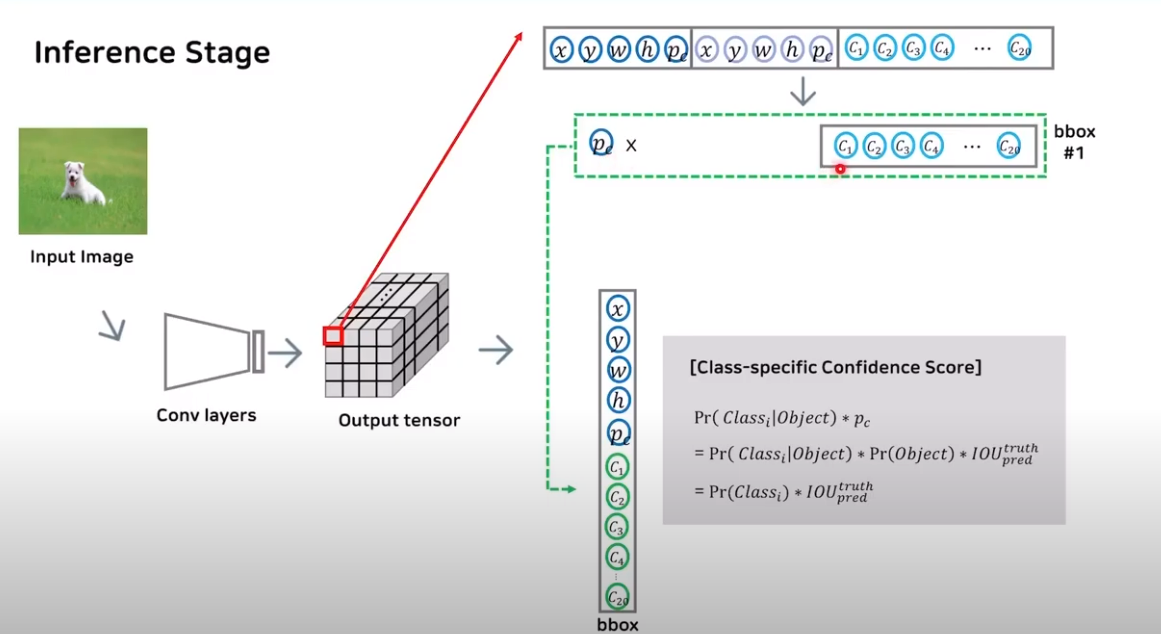 - 물체가 bbox 안에 있을 때, grid cell에 있는 object가 i번째 class에 속할 확률값 ( class: 20개 )ex) 고양이: 0.88 강아지: 0.01 새: 0.005