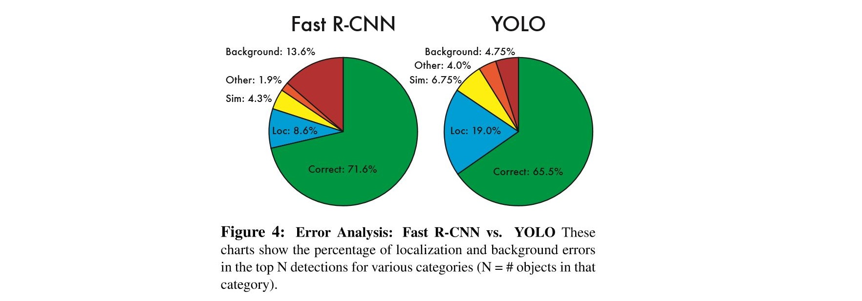 - Fast R-CNN과 비교했을 , 훨씬 적은 False-Positive를 보여줌. (low backgound error)⇒ background에 아무것도 없는데 있다고 하는 확률을 줄인 것을 말함