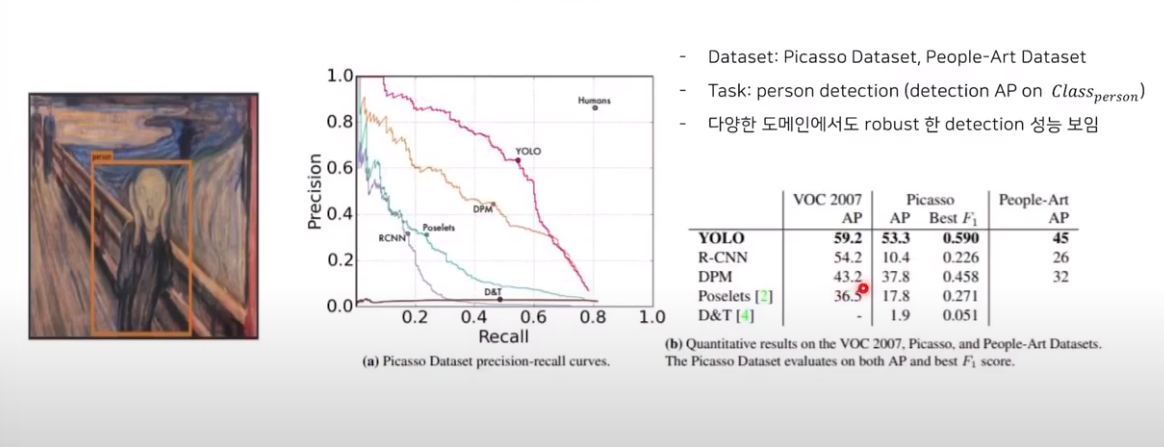 - 그림 안에 있는 객체를 찾아내는 것에 있어서 YOLO에 비해 다른 모델들은 현저히 떨어짐을 확인할 수 있음