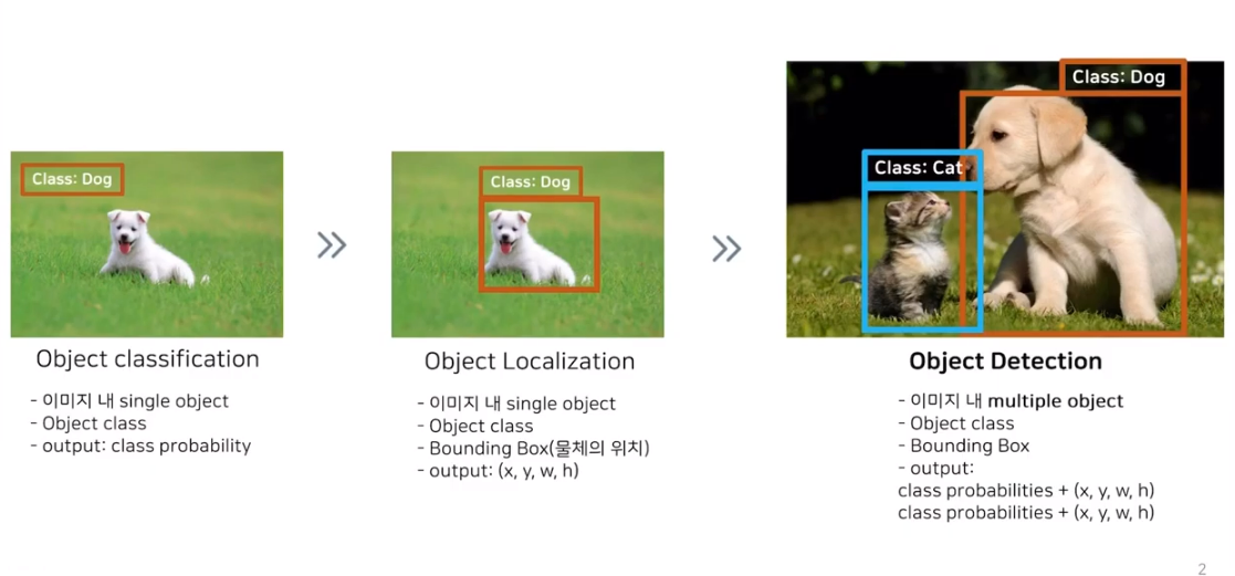 - object localization: 하나의 이미지 내에서 개는 어디에 위치하는지 판단 → output: x,y,w,h