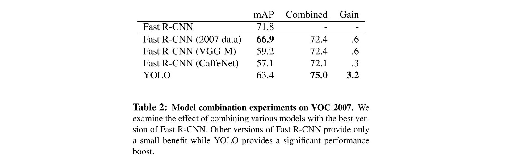 - Fast R-CNN과 YOLO를 combine 했을 때 3.2% 더 증가했음 ⇒ 효과가 더 좋았다!