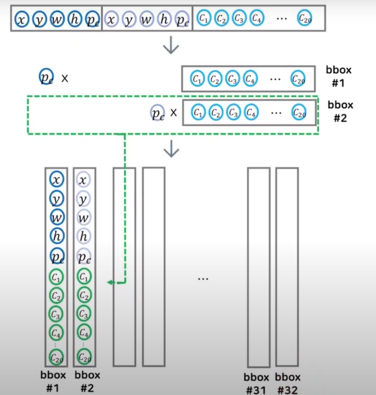 - bbox1: bbox1에 대한 좌표값(x,y,w,h,c)+ class-specific confidence score가 하나의 bbox1이 되는 것임