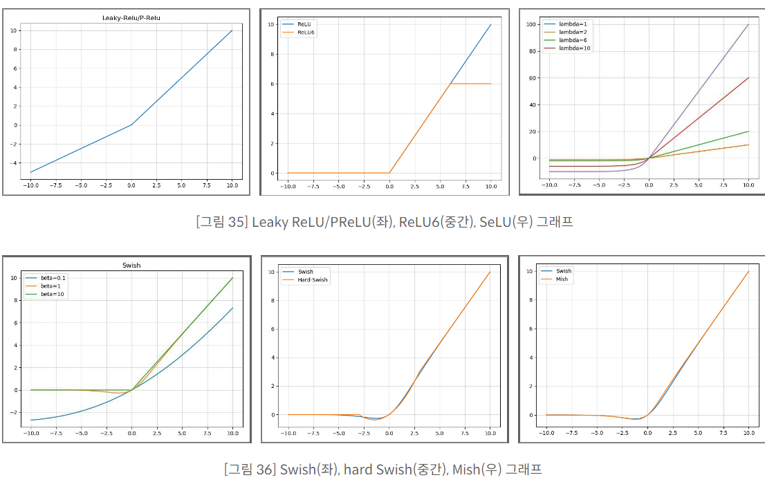 LReLU와 PReLU는 ReLU의 출력이 음수일 때 기울기가 0이 되는 문제를 해결하기 위해 고안되었습니다. ReLU6와 hard-Swish는 양자화 네트워크를 위해 특별히 설계된 함수입니다. SELU 활성화 함수는 신경망의 자기 정규화를 위해 제안되었습니다. Swish와 Mish는 연속적으로 미분 가능한 활성화 함수입니다.