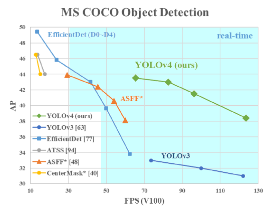 - OLO v4는 EfficientDet과 비슷한 AP 성능을 내면서도 2배 더 빠른 FPS를 보유.