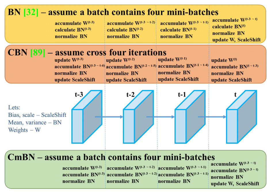 - CmBN은 CBN을 변형시킨 버전으로, Cross mini-Batch Normalization을 의미함