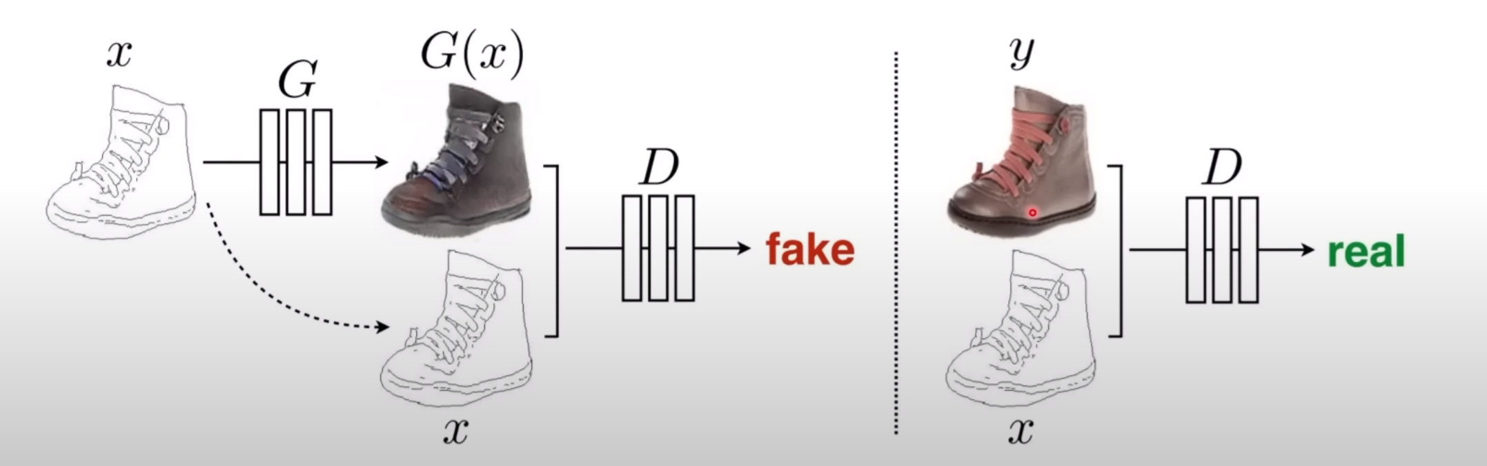 ⇒ 단점: 서로 다른 두 도메인 x,y의 데이터 두개를 한쌍으로 묶어서 학습을 진행시킴 (손그림과 그에 맞는 사진-condition)